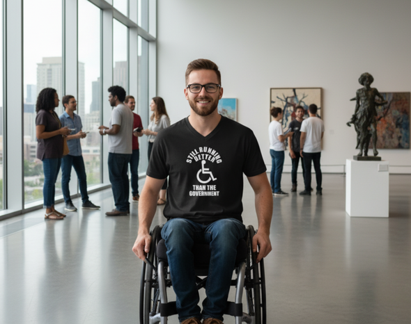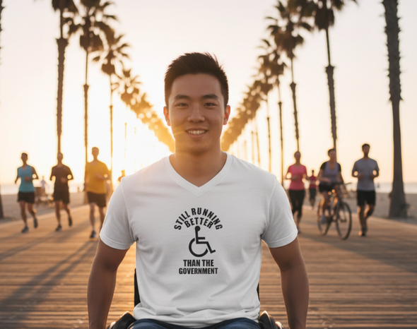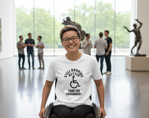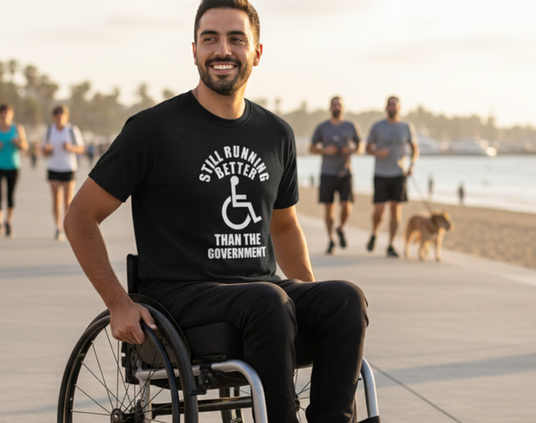 Who needs a budget when you’ve got wheels? This hilarious tee declares “STILL RUNNING BETTER THAN THE GOVERNMENT” alongside a wheelchair graphic, proving that true efficiency comes from focused effort, not endless debates. Perfect for anyone who navigates life with a sharp wit and gets things done without all the red tape.