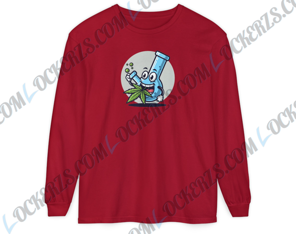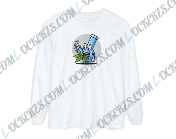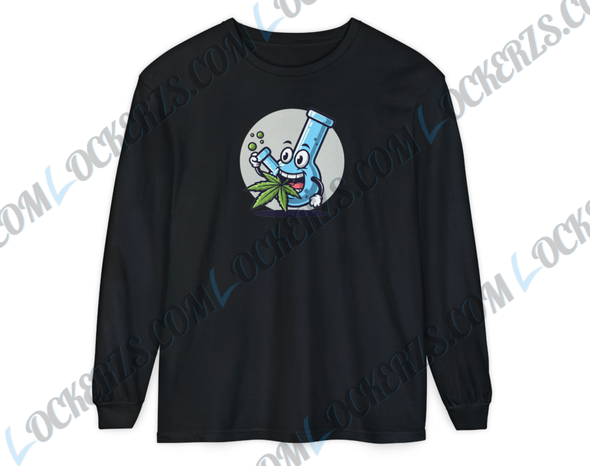 This unique design features a cheerful, cartoon bong character holding a vibrant cannabis leaf. The playful illustration is screen-printed on a high-quality, long-sleeve cotton tee, making it a comfortable and stylish addition to your wardrobe. Perfect for casual wear, festivals, or as a fun gift for a friend.