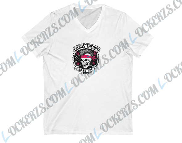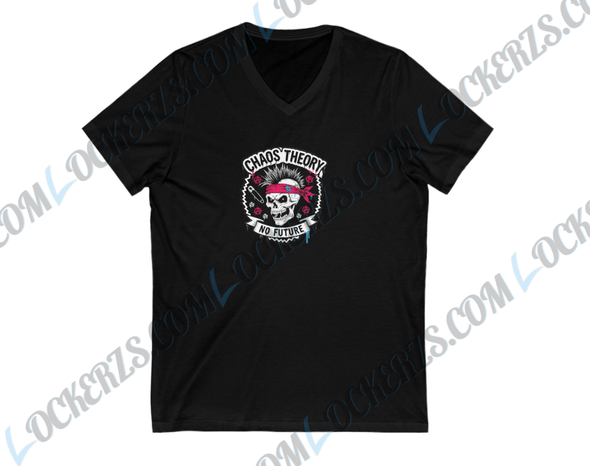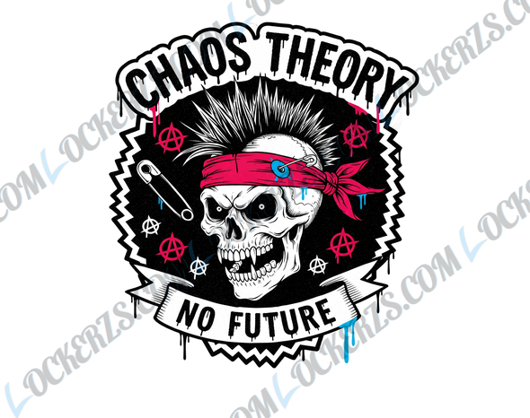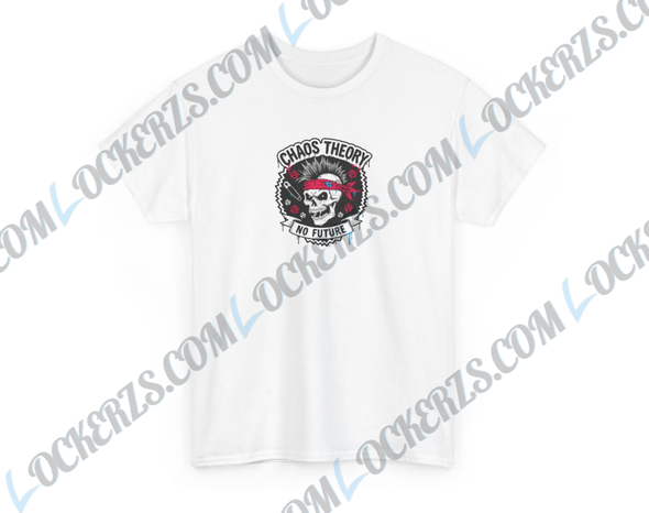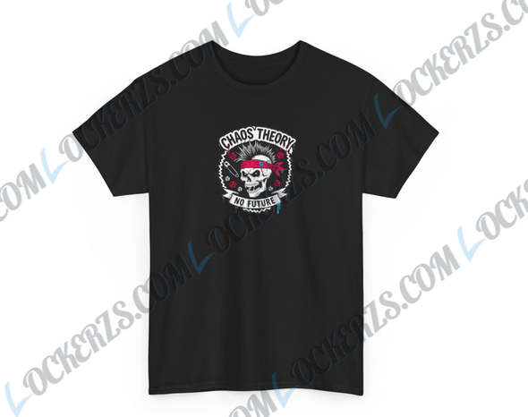 Embrace the rebellious spirit with this bold “Chaos Theory No Future” t-shirt. Featuring a striking graphic of a skull adorned with a red bandana, safety pins, and the anarchy symbol, this tee embodies punk rock attitude. The distressed text “CHAOS THEORY” arcs above the skull, while “NO FUTURE” makes a strong statement below. Perfect for expressing your individuality and love for punk aesthetics.