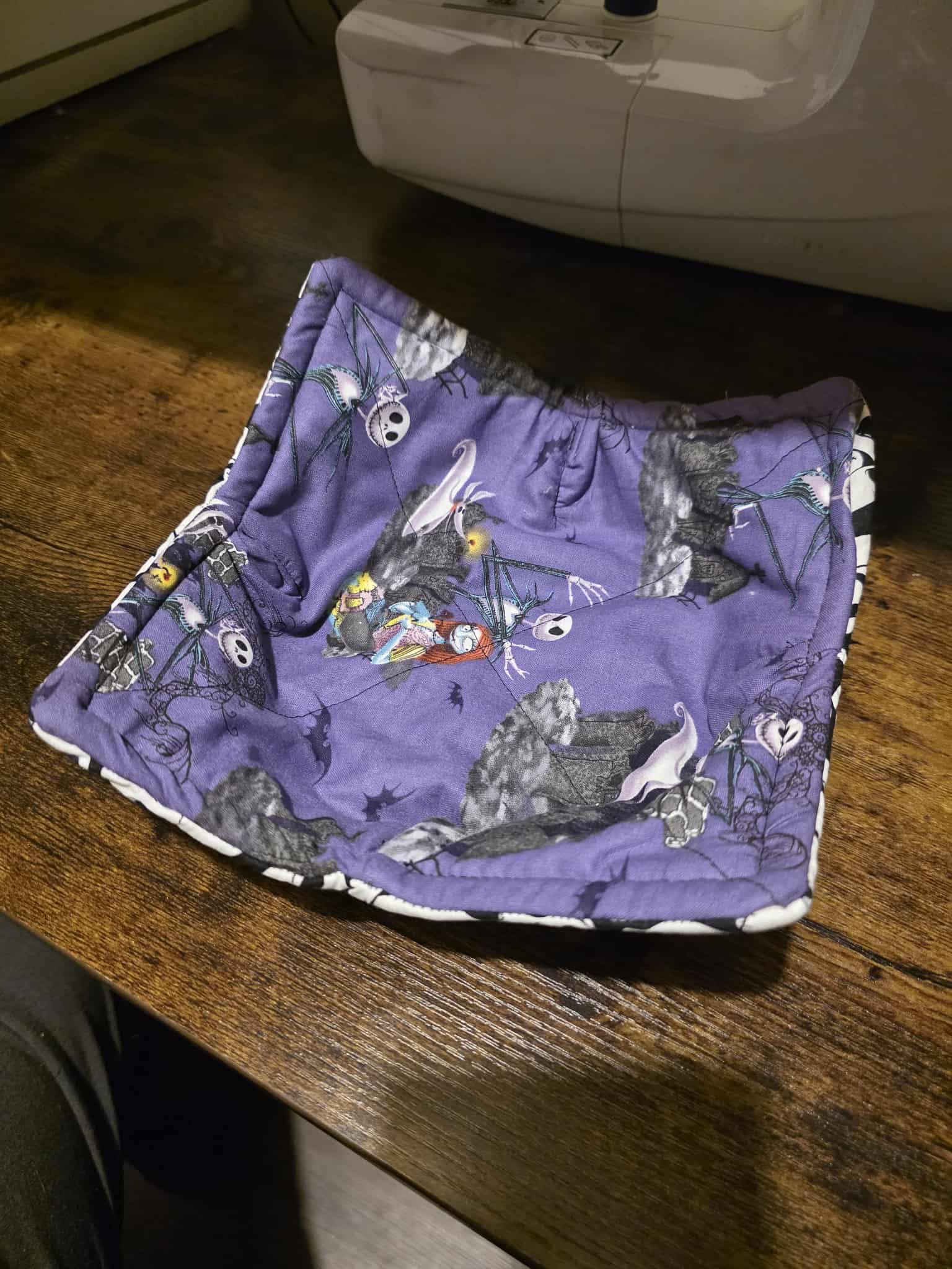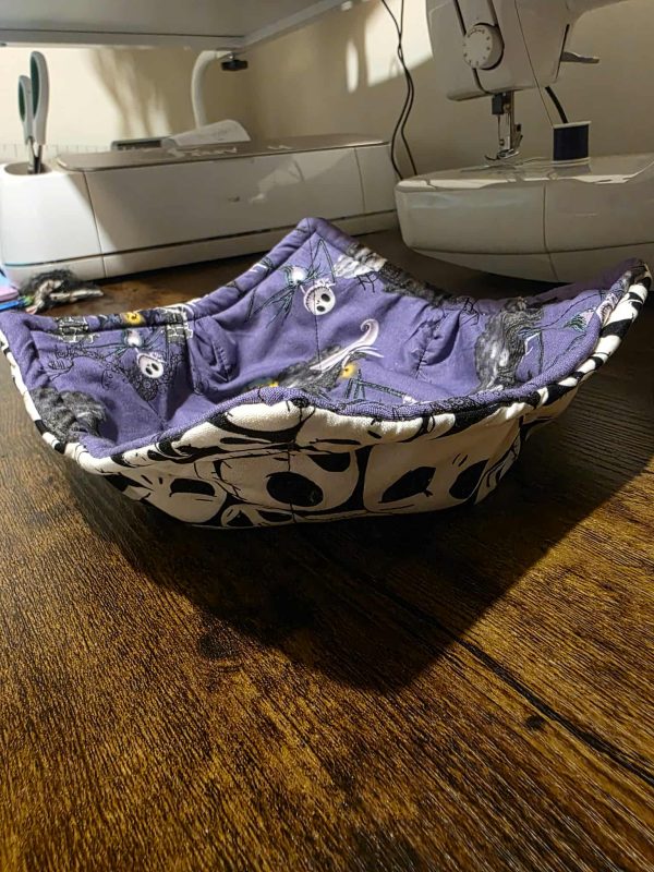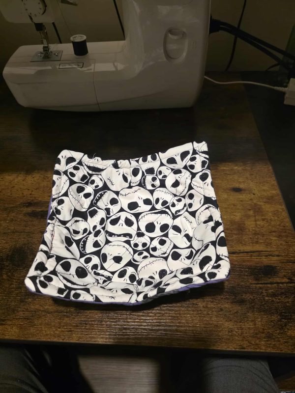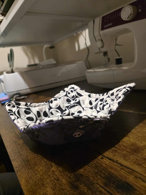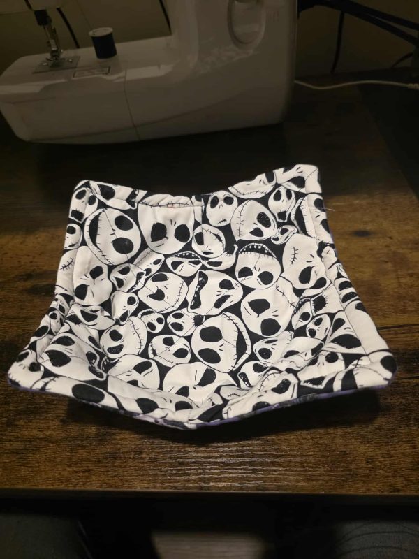 Bring a little bit of Halloween Town magic to your midnight snacks and spooky season meals! This reversible hot bowl cozy is a must-have for fans. One side features a striking black and white print of the iconic Pumpkin King’s faces, while the reverse shows a fun, spooky scene against a rich purple background.