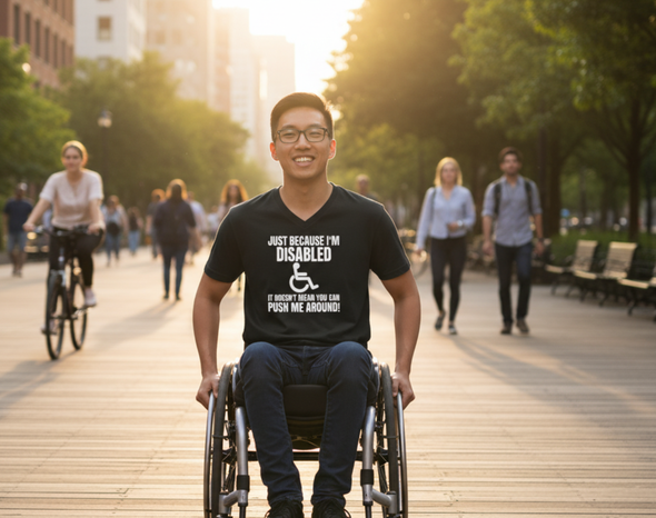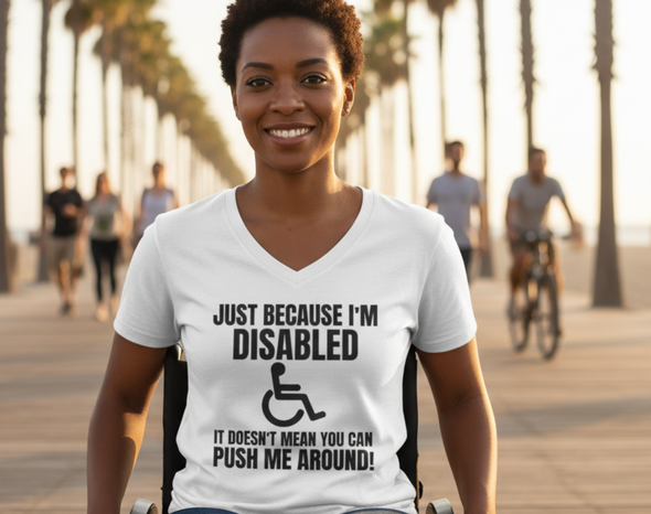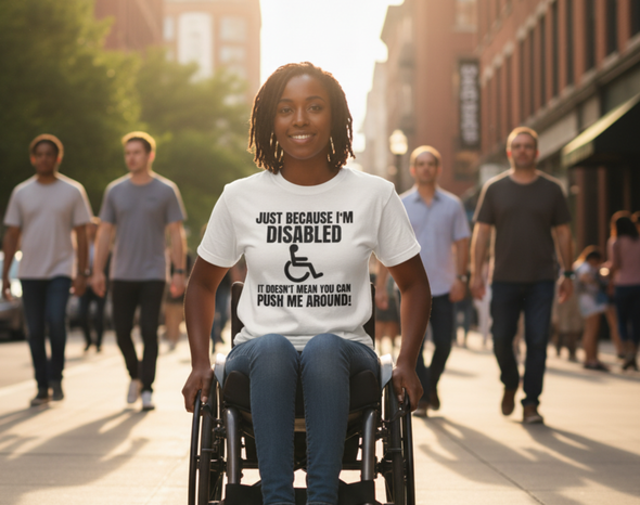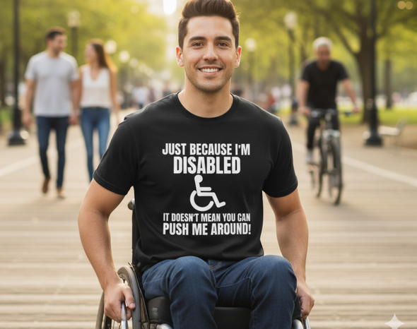 Tired of being treated like a shopping cart? This shirt says it all (with a wink and a smile!). Featuring the undeniable truth, ‘Just because I’m disabled doesn’t mean you can push me around,’ it’s perfect for anyone who’s got boundaries and a great sense of humor. Trust us, your arms are just fine where they are.