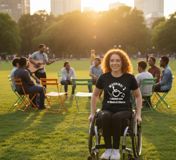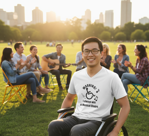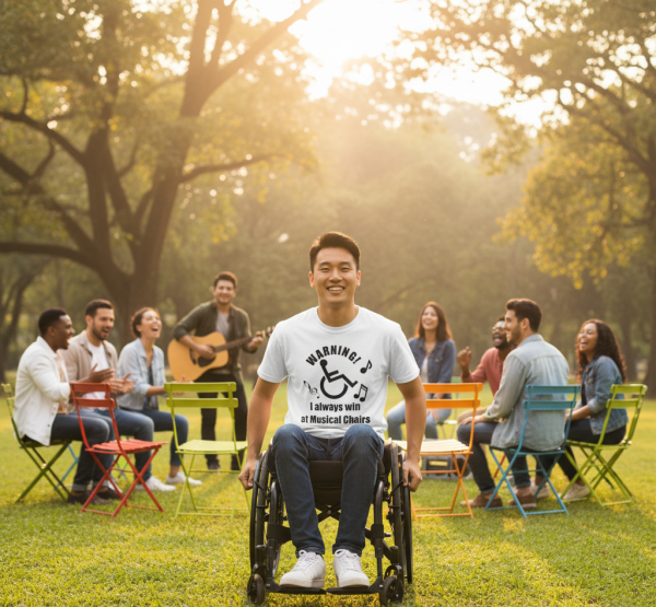 Step aside, amateurs! This hilarious tee declares ‘WARNING: I ALWAYS WIN AT MUSICAL CHAIRS’ alongside a picture of a guy confidently in his wheelchair. It’s the ultimate boast for anyone who knows how to play the game (or avoid it altogether) with strategic precision and a fantastic sense of humor.