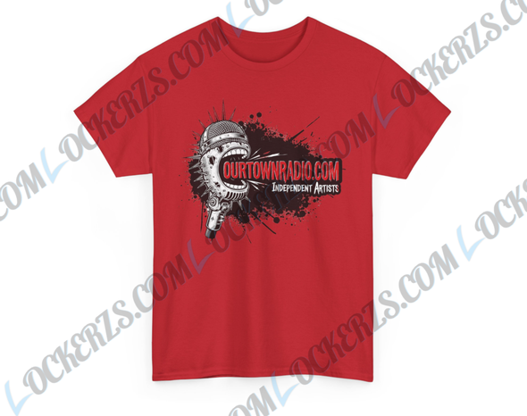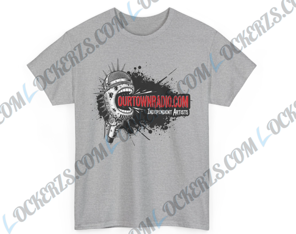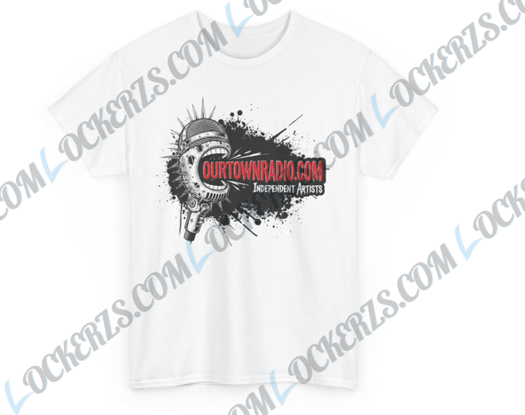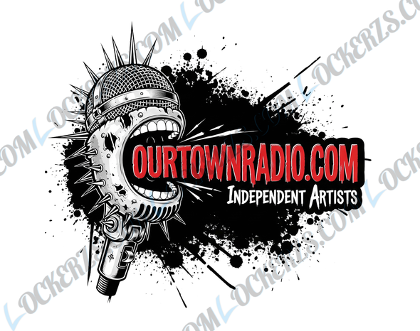 This dynamic design features a detailed, vintage-style microphone bursting through a splatter of dark paint, symbolizing the raw and explosive power of independent music. The “OURTOWNRADIO.COM” and “Independent Artists” text are integrated into the splatter, making it a unique and bold way to show your support.