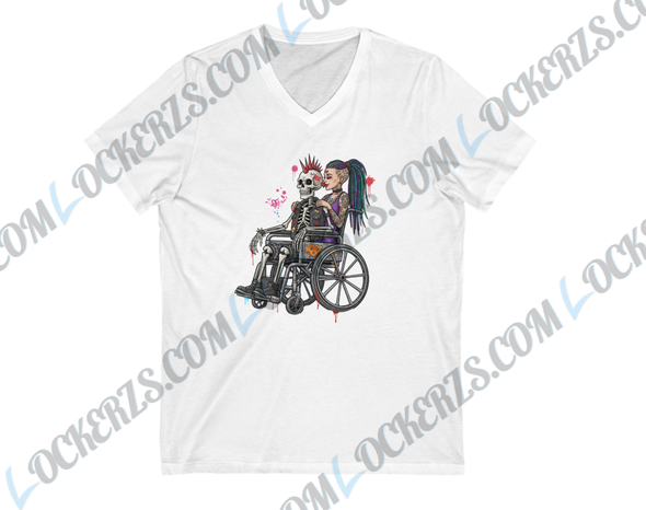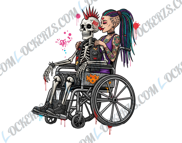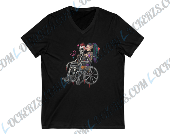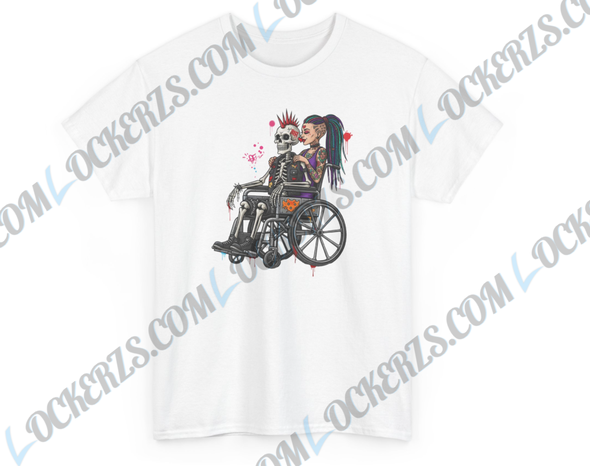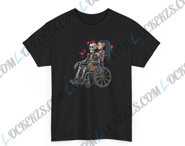This tee captures a uniquely heartwarming scene: a skeleton in a wheelchair sharing a tender moment with his loving girlfriend. It’s a playful yet poignant design that reminds us love transcends all boundaries—even those of life and death! Perfect for anyone who appreciates a touch of gothic romance, dark humor, or simply a sweet and unusual declaration of everlasting affection.