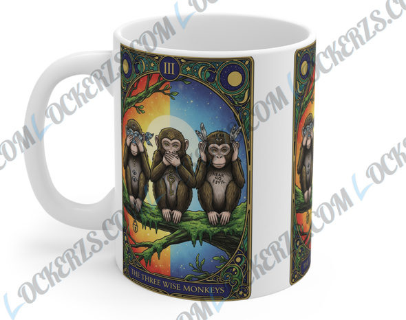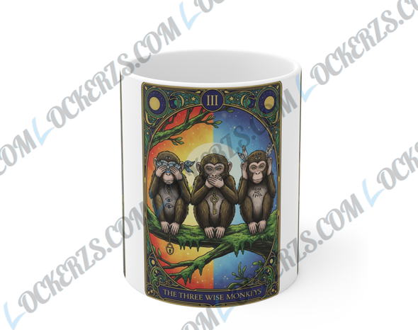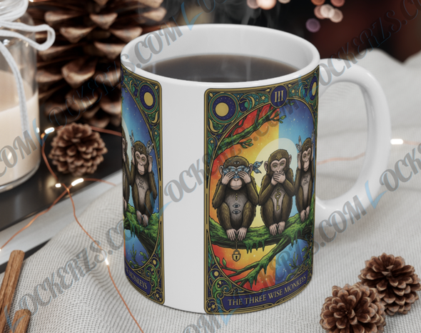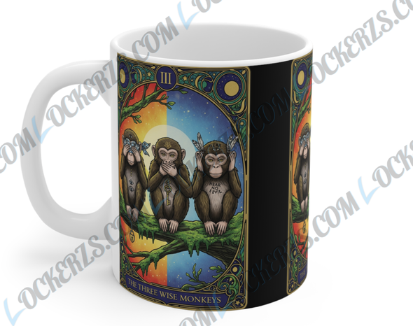 The detailed artwork depicts three wise monkeys perched on a branch, each embodying one of the three wise maxims. The rich colors, celestial backgrounds, and intricate border patterns give this mug a magical, esoteric feel. It’s not just a mug—it’s a work of art that invites contemplation and brings a little bit of ancient wisdom to your day.