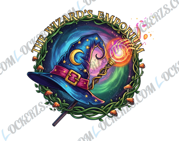At the heart of the design is a beautifully illustrated wizard’s hat, adorned with a glowing crescent moon and stars, encircled by vibrant, twisting vines and mystical mushrooms. A glowing orb, a source of potent magical energy, hovers nearby, casting a warm, ethereal light. The words “The Wizard’s Emporium” arc gracefully above the imagery, inviting you to become a part of this enchanting universe. The intricate details and rich, vivid colors — from deep blues and purples to fiery oranges and greens — make this design truly stand out.
