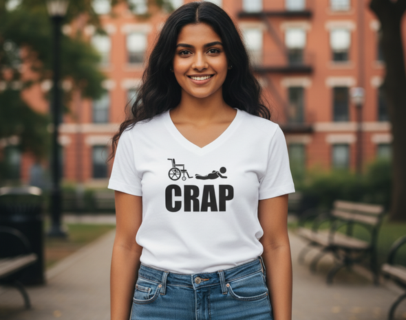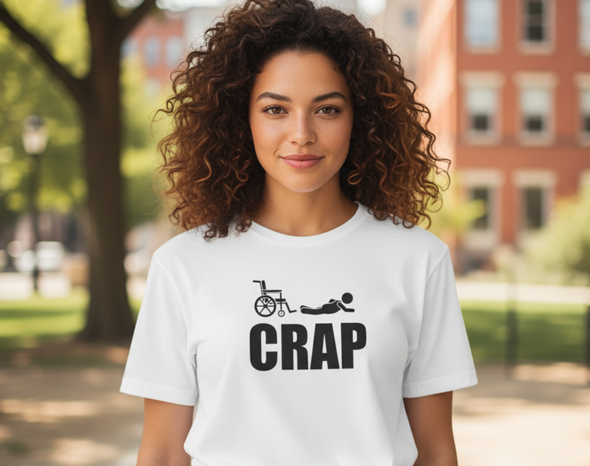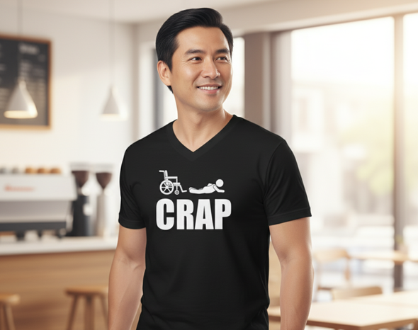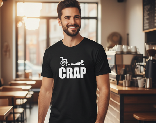 “Ever had one of those ‘Oh Crap!’ moments? This tee captures the universally relatable feeling of life’s little (and sometimes not so little) tumbles. Featuring a person hilariously navigating an unexpected exit from a wheelchair, it’s perfect for anyone with a good sense of humor and a knack for embracing life’s less-than-graceful moments. It’s not about the fall, it’s about the ‘Oh Crap!’