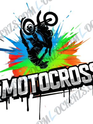 The bold graphic features an aggressive “MOTOCROSS” text design in vibrant orange and yellow, splattered with dynamic paint strokes, giving it a gritty, street-art vibe. Above, a silhouette of a rider conquers a formidable tire, embodying the thrill of the sport. Below, crossed checkered flags signal victory and the essence of the race.